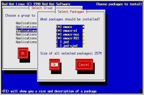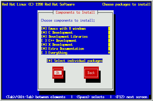 After selecting the components you wish to install, you may select or deselect individual packages. The installation program presents a list of the package groups available; select a group to examine and press [Enter]. The installation program presents a list of the packages in that group, which you may select or deselect by using the arrow keys to highlight a package, and pressing [Space] (see Figure 30).