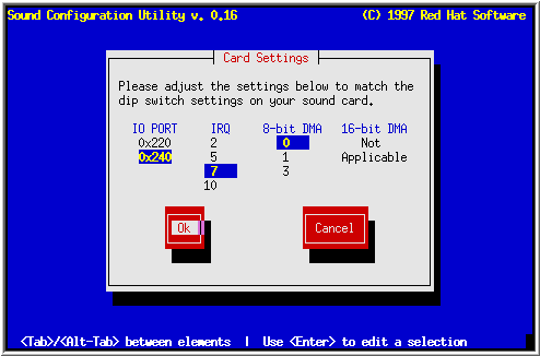 After selecting your sound card, you'll see a screen similar to the one in Figure 50. Here is where you can specify the settings for your sound card. Using the [Tab] key, select a field. Then use the arrow keys to select the desired setting for that field. When finished, select Ok, and press [Space].
