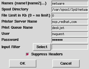 After choosing the printer type, a dialog box requests further information about the print queue (see Figure 109). All types of print queues require the following information: