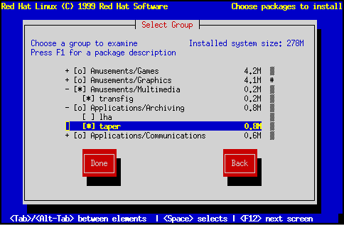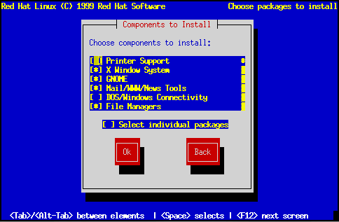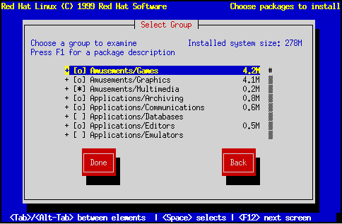 After selecting the components you wish to install, you may select or deselect individual packages. The installation program presents a list of the package groups available; using the arrow keys, select a group to examine and press [Enter] or [Space]. The installation program presents a list of the packages in that group, which you may select or deselect by using the arrow keys to highlight a package, and pressing [Space] (see Figure 55).