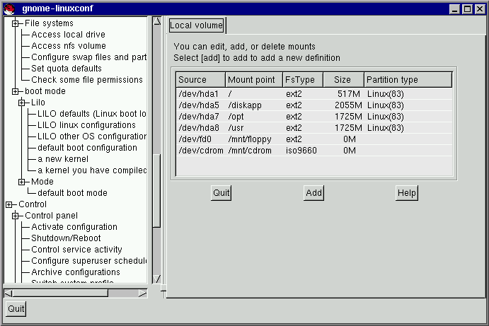 This is all you need to get the mount created. Linuxconf will update your /etc/fstab file accordingly. If you are aware of additional requirements, please read the help file on the Volume specification screen and see the mount man page for more information.