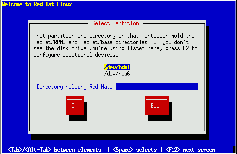 Enter the device name of the partition containing the RedHat directory tree. There is also a field labelled "Directory holding Red Hat:." If the RedHat directory is not in the root directory of that partition, enter the path to the RedHat directory (for example, /test/new/RedHat).