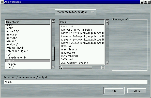 Choose the Add button. By default, if your CD-ROM is mounted with a Red Hat Linux CD-ROM, Gnome-RPM will search in /mnt/cdrom/RedHat/RPMS for new packages. (You can find this default option in the Install Window tab of the Preferences dialog. See the section called Configuration for more information on this feature.)