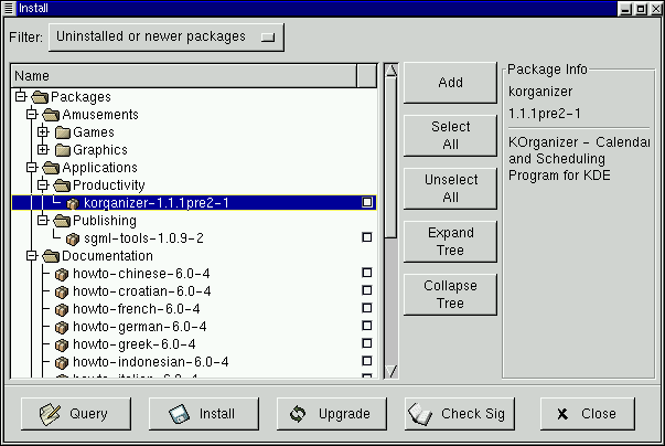 By clicking on the item, you'll find a brief description of the package in the Package Info panel of the Install window. To perform an installation or a query on the package, click inside the checkbox next to the package, then select the Install button. You can also query the item once it's checked; from within the Package Info window, you can also perform the installation (see Figure 6-10 in the section called Querying Packages for an example).