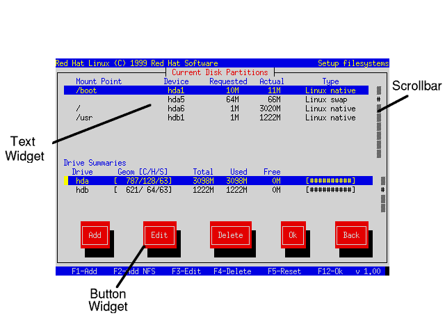 Cursor -- Although not a widget, the cursor is used to select (and interact) with a particular widget. As the cursor is moved from widget to widget, it may cause the widget to change color, or you may only see the cursor itself positioned in or next to the widget. In Figure 8-1, the cursor is positioned on the Ok button. Figure 8-2 shows the cursor on the first line of the text widget at the top of the window.