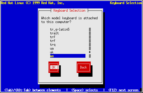After selecting the appropriate keyboard type, press Enter; the keyboard type you select will be loaded automatically both for the remainder of the installation process and each time you boot your Red Hat Linux system.