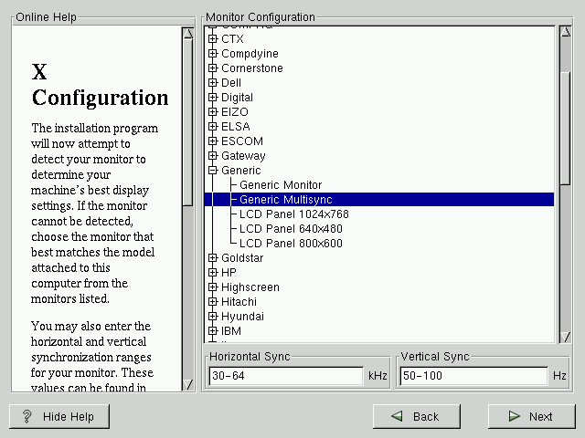 If your monitor does not appear on the list, select the most appropriate Generic model available. If you do select a Generic monitor, Xconfigurator will suggest horizontal and vertical sync ranges. These values are generally available in the documentation which accompanies your monitor, or from your monitor's vendor or manufacturer; please check your documentation to make sure these values are set correctly.