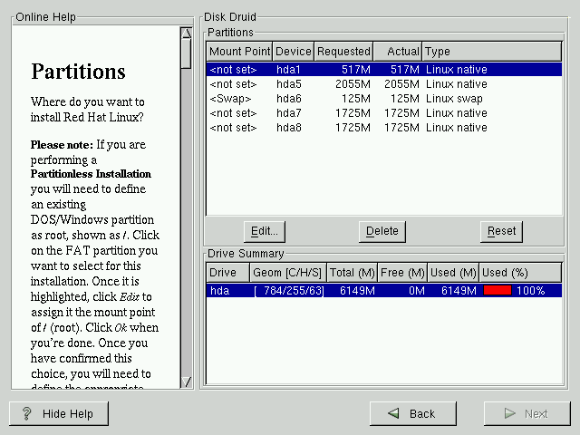 After you have partitioned your drive(s), click Next. You will then use Disk Druid to assign mount points to your partitions.