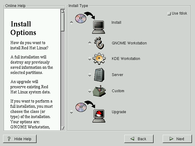 In the top right-hand corner of the Install Type screen there is a box you may select if you wish to partition using fdisk. Note that fdisk is not as intuitive to use as Disk Druid and is not selected by default. If you have not used fdisk before, you should read about both fdisk and Disk Druid to determine which will best suit your needs.