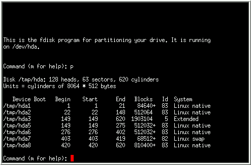 None of the changes you make take effect until you save them and exit fdisk using the w command. You can quit fdisk at any time without saving changes by using the q command. |