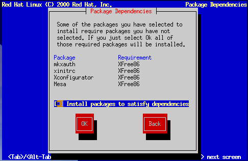 After you have finished selecting packages to install, the installation program checks the list of selected packages for dependencies. If any package requires another package which you have not selected to install, the program presents a list of these unresolved dependencies and gives you the opportunity to resolve them (see Figure 10-36). If you simply press OK, the program will resolve them automatically by adding all required packages to the list of selected packages.