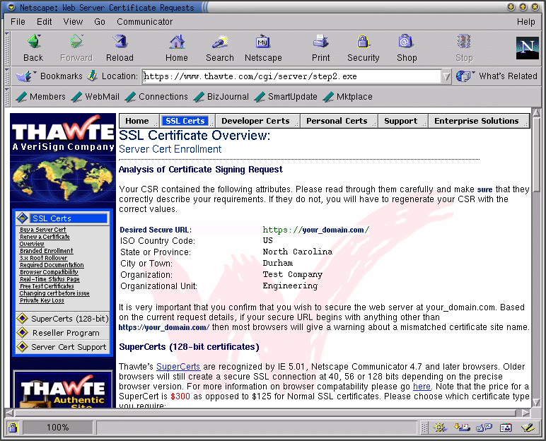 21. Nach dem Erhalt der Dokumente und der Zahlung sendet Thawte das Zertifikat per E-Mail. Speichern Sie das erhaltene Zertifikat in die Datei /etc/httpd/conf/ssl.crt/server.crt. Anweisungen zur Installation Ihres Zertifikats finden Sie unter Abschnitt namens Testen Ihres Zertifikats.