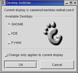 Hierzu steht Ihnen das Dienstprogramm Switchdesk zur Verfügung (siehe Abbildung 2-11). Mit Switchdesk können Sie unter GNOME, KDE und AnotherLevel Ihre neue Umgebung wählen. Sobald Sie dann Ihre Sitzung neu starten, wird Ihre neue Benutzeroberfläche verwendet.