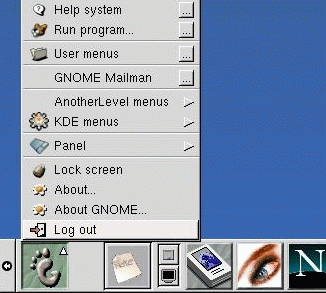 Pour vous déconnecter de GNOME, cliquez une fois sur le Bouton du menu principal dans le tableau de bord , puis faites glisser le curseur de la souris vers le premier élément (Log out, comme à la Figure 1-7).