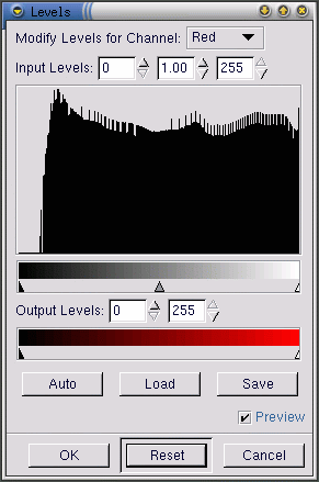 Tout d'abord, nous allons utiliser GIMP pour procéder à une correction automatique des couleurs. Cliquez avec le bouton droit sur l'image, puis sélectionnez Image => Colors => Levels pour afficher la boîte de dialogue Levels. Puisque nous cherchons à améliorer la couleur, dans le menu déroulant Modify Levels for Channel, sélectionnez Red, comme illustré à la Figure 9-10.