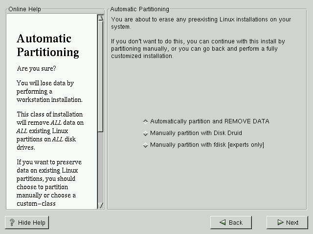If the Automatic Partitioning screen does not appear, then you do not have enough free space available for this installation option. You can either exit out of the installation program and then make space available, or you can partition manually. |