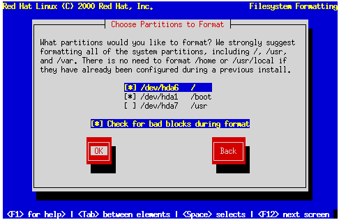 When you have selected the partitions to format, press Space. If you wish to check for bad blocks while formatting each filesystem (recommended for those with older disk drives), select Check for bad blocks during format. Select OK, and press Space.