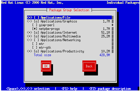 Per visualizzare la lista dei pacchetti della categoria Applications/Editors, per esempio, usate le frecce per selezionare questo gruppo e premete Enter o Space. Quando fate questo, il segno + (chiuso) si tramuterā in - (aperto) e verrā visualizzata una lista di pacchetti di questa categoria. Il segno * apparirā di fianco ai pacchetti selezionati. Premete Enter o Space per selezionare o deselezionare i pacchetti.