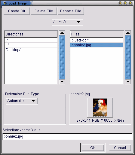 El diálogoLoad Image muestra el directorio en funcionamiento cuando empezó GIMP. Puede navegar arriba y abajo del árbol del sistema de archivos haciendo click dos veces en la lista de la izquierda Directories, y después seleccionando un archivo para abrir de la lista en la derechaFiles.