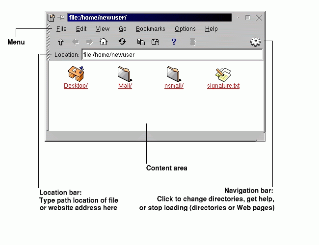 Si ya ha usado el gestor de ficheros o un navegador web, se sentirá a gusto trabajando con KFM. Puede teclear el path (ruta) de un fichero (o la dirección de un sitio FTP) en la barra Situación. Sobre la barra Situación, los iconos de la barra Navigation bar le ayudarán a moverse a otros directorios. A continuación, una breve explicación de para qué sirven los iconos: