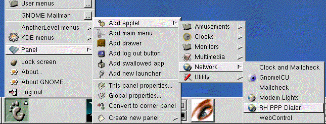 Vous pouvez démarrer RP3 en allant au Bouton du menu principal de >GNOME => Panel => Add applet => Network => RH PPP Dialer (reportez-vous à la Figure 6-1). L'application se loge alors dans le tableau de bord où elle reste jusqu'à ce que la supprimiez (en cliquant avec le bouton droit sur l'application logée, puis en sélectionnant l'option Remove from panel).