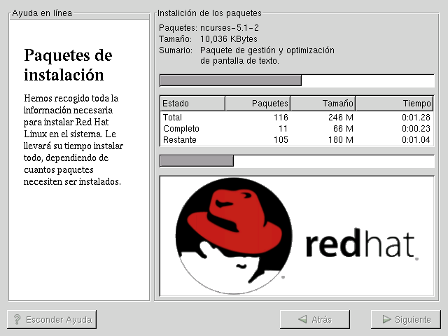 Además, le será requerida la inserción de otro CD-ROM Red Hat Linux para que la instalación de paquetes continúe. Si elige una instalación workstation-class, y no ha seleccionado los paquetes individualmente, no tendrá que insertar el segundo CD-ROM.