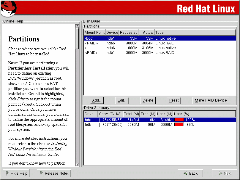 Le logiciel RAID peut être configuré durant l'installation graphique de Red Hat Linux ou au cours d'une installation kickstart. Vous pouvez utiliser soit fdisk soit Disk Druid pour créer votre configuration RAID. Les instructions que nous vous donnons ici se concentrent sur l'utilisation de Disk Druid pour compléter cette tâche.