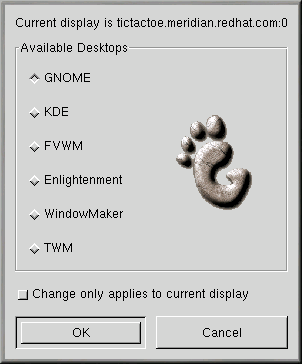 Outre la modification de votre environnement graphique au niveau de l'écran de connexion, vous pouvez "commuter" vers un autre environnement une fois que vous êtes connecté. Vous pouvez changer d'environnement à l'aide de l'utilitaire Switchdesk (reportez-vous à la Figure 3-10). Lorsque vous redémarrez votre session, vous découvrez votre nouvel environnement.