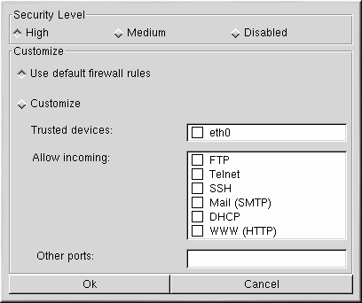 Klicken Sie auf die Schaltfläche Firewall, um die Firewall-Einstellungen für Ihr System zu konfigurieren. Das in Abbildung 2-4 gezeigte Firewall-Fenster entspricht dem Firewall-Bildschirm, der während des Red Hat Linux Installationsprogramms verwendet wird. Weitere Informationen über die Konfiguration der Firewall-Einstellungen finden Sie im Offiziellen Red Hat Linux Installationshandbuch.