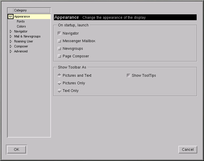 Um das Surfen im Internet zu optimieren, können Sie viele Einstellungen in Navigator nach Ihren Wünschen festlegen. Wählen Sie hierzu im Menü Edit=>Preferences, um das Menü für die Einstellungen anzuzeigen (siehe Abbildung 7-3).