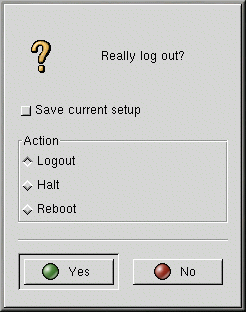 Wählen Sie eine der Optionen aus, und klicken Sie, um fortzufahren, auf den Button Yes. Wenn Sie Ihre Sitzung sichern möchten, wählen Sie außerdem die Option Save current setup. Das Sichern Ihrer Sitzung bewahrt Ihre aktuelle Konfiguration des Panel und sichert Programme, die eventuell noch geöffnet sind.