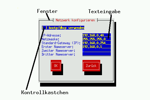 Texteingabe — In die Texteingabezeilen geben Sie die für das Installationsprogramm relevanten Informationen ein. Zur Dateneingabe muss der Cursor in die Texteingabezeile gesetzt werden.