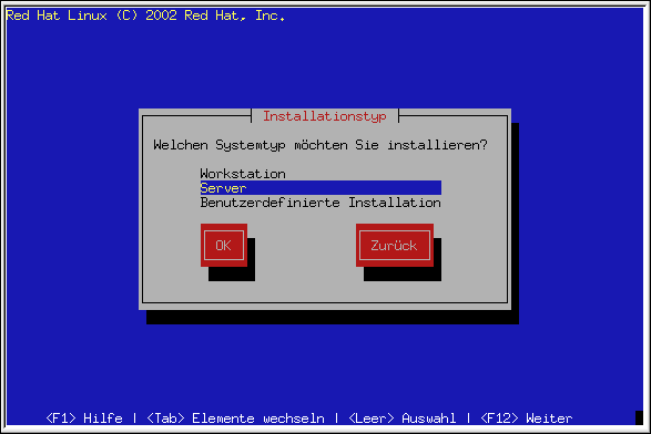 Red Hat Linux gibt Ihnen die Möglichkeit, den für Sie am besten geeigneten Installationstyp auszuwählen. Als Optionen stehen Workstation, Server oder Benutzerdefiniert zur Verfügung.