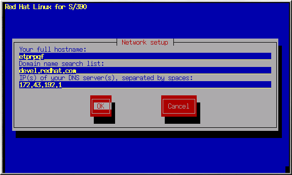 Die IP-Adresse Ihrer Netzwerkverbindung wurde hier bereits von der Boot-Phase des Installationsprozesses eingestellt. Dieser Schritt erfordert zusätzliche Informationen: Hostname, Such-Reihenfolge der Domänennamen, IP-Adresse(n) des/der DNS(s) (Domain Name Server). Wenn mehr als ein Eintrag in der Such-Reihenfolge der Domänennamen oder mehrere DNS angegeben sind, trennen Sie diese durch ein Leerzeichen voneinander.