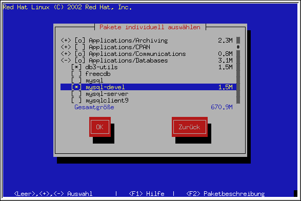 Einige Pakete (wie zum Beispiel der Kernel und bestimmte Bibliotheken) sind für jedes Red Hat Linux System erforderlich und können nicht selektiert oder deselektiert werden. Diese Pakete sind bereits standardmäßig ausgewählt. |