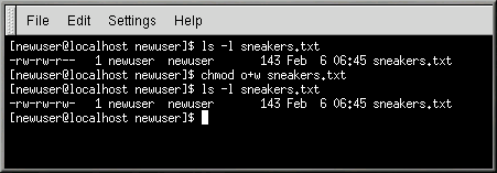 The file's owner (in this case, newuser) has permission to read and write to the file. It is not a program, so newuser doesn't have permission to execute it. The group, newuser, has permission to read and write to sneakers.txt, as well. Similar to the program notation for owner newuser, there's no execute permission for group newuser.