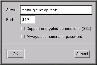 Para empezar, pulse el botón Add. En la ventana que se abrirá, (veáse el Figura 7-11) introduzca la información sobre el servidor de noticias proporcionado por su proveedor de Internet.