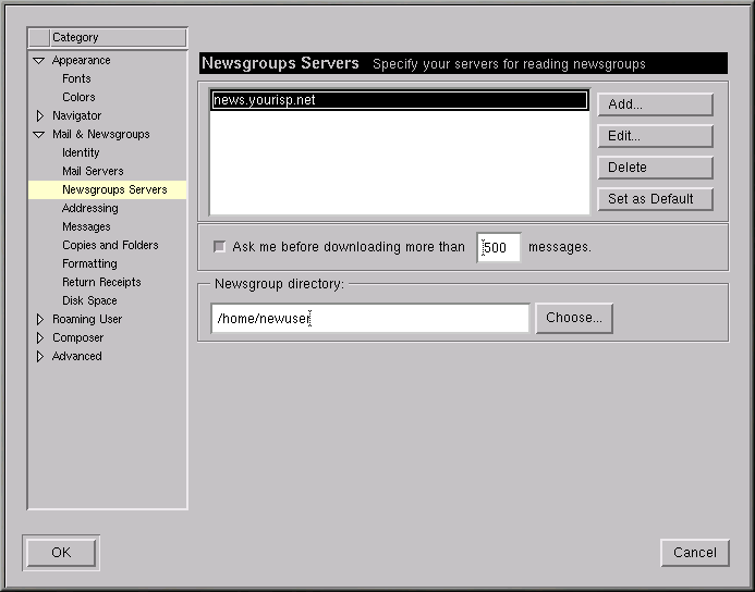 Puede especificar dónde quiere que guardar el correo escribiendo la dirección en el Local mail directory, o pulsando el botón Choose y seleccionando un directorio en la ventana del navegador que se abrirá. Por defecto el correo será enviado a un directorio en el directorio principal del usuario. Si su nombre es newuser, por ejemplo, el recorrido del directorio será /home/newuser/nsmail.
