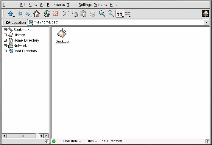 Cuando la ventana de su directorio home se abra, podrá ver algo parecido al Figura 11-6. Por defecto, la ventana contendrá iconos y conexiones asociadas a los ficheros presentes en el sistema. Puede cambiar esta visualización, entrando en el menú View.