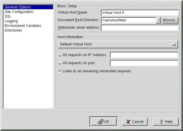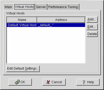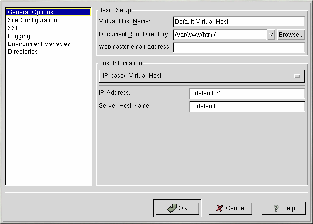 L'outil de configuration d'Apache comprend un hôte virtuel par défaut, comme indiqué dans la Figure 11-8. Reportez-vous à la section intitulée Default Virtual Host pour avoir plus de détails sur l'hôte virtuel par défaut.