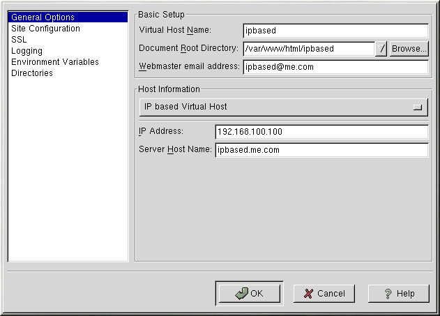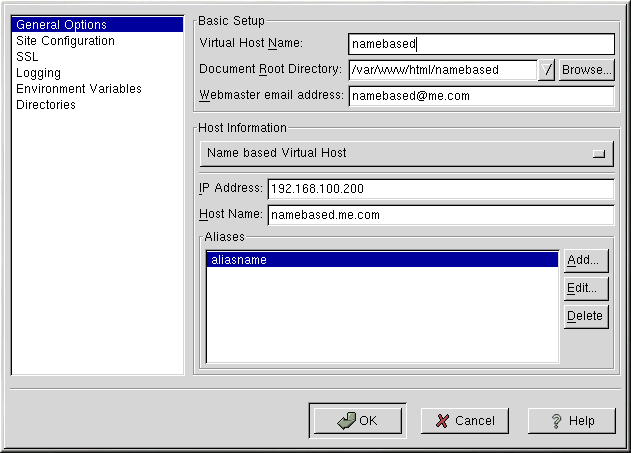 Les paramètres des options générales ne s'appliquent qu'à l'hôte virtuel que vous configurez. Définissez le nom de l'hôte virtuel dans la zone de texte Virtual Host Name. Ce nom sera utilisé par l'outil de configuration d'Apache pour distinguer cet hôte des autres hôtes virtuels.
