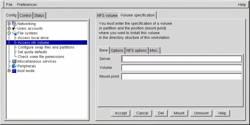 C'est tout ce que vous devez faire pour créer le montage. Ce faisant, Linuxconf met à jour votre fichier /etc/fstab en fonction des informations fournies. Si vous avez d'autres besoins, veuillez lire le fichier d'aide de l'écran Volume specification et consultez la page de manuel mount pour avoir plus d'informations.