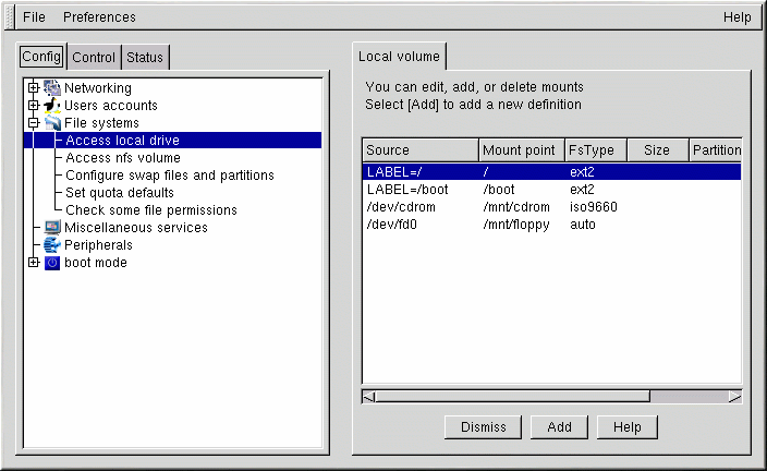 Grâce aux informations du fichier /etc/fstab, vous pouvez entrer mount et le point de montage ou le périphérique. La commande mount recherche alors les autres informations dans le fichier /etc/fstab. En outre, vous pouvez modifier ce fichier manuellement ou à l'aide de Linuxconf.