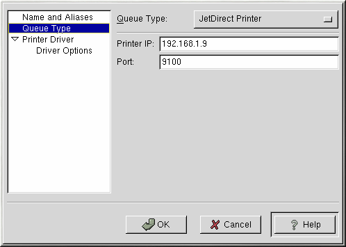 Pour ajouter une imprimante JetDirect, cliquez sur le bouton Add dans la fenêtre principale de printconf. La fenêtre indiquée dans la Figure 13-1 s'ouvre. Entrez un nom unique pour l'imprimante dans le champ Queue Name. Vous pouvez choisir n'importe quel nom descriptif pour cette imprimante. Vous pouvez également lui attribuer des surnoms en cliquant sur le bouton Add à côté de la liste Aliases. Reportez-vous à la la section intitulée Création de surnoms pour les imprimantes pour en savoir davantage sur les surnoms. Les noms et surnoms des imprimantes ne doivent pas contenir d'espace et doivent commencer par une lettre comprise entre a et z ou A et Z. Vous pouvez utiliser les caractères suivants : a à z, A à Z, 0 à 9, - et _.