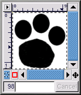 Lorsque vous dessinez, il est toujours plus facile de dessiner une image de grande taille, puis de la réduire à la fin. Pour composer l'image, créez une sélection ovale, puis utilisez l'outil seau pour remplir la sélection de noir. Copiez la sélection ovale à l'aide du bouton Select elliptical regions. Utilisez ensuite l'instrument seau pour remplir la sélection de noir. Copiez la sélection ovale (Ctrl-c) et collez-la (Ctrl-v)à deux reprises de manière à disposer les trois ovales de façon appropriée. Utilisez ensuite l'outil pinceau avec une petite brosse pour dessiner le coussinet de la patte. L'image originale en noir et blanc, d'une taille de 128 x 134 pixels, ressemble à la Figure 9-15.