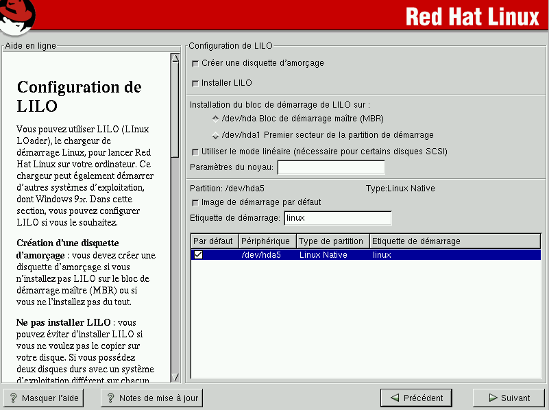 Utilisation à la place de LILO -- Vous pouvez utiliser une disquette d'amorçage au lieu de LILO. Cette fonction est pratique si vous essayez Red Hat Linux pour la première fois et vous vous sentez plus rassuré de savoir que le processus de démarrage de votre autre système d'exploitation reste intact. Si vous disposez d'une disquette d'amorçage, il suffit, pour revenir à votre autre système d'exploitation, de retirer la disquette d'amorçage et de redémarrer le système. Si vous préférez utiliser une disquette d'amorçage au lieu de LILO, désactivez l'option Installer LILO.