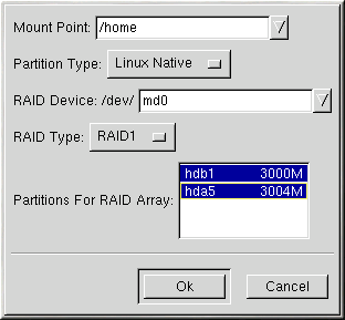Ripetete questi passi per creare tutte le partizioni necessarie per configurare il vostro RAID. Non tutte le partzioni devono essere RAID. Per esempio, nella Figura 4-2, solo la partizione /home è un dispositivo software RAID.