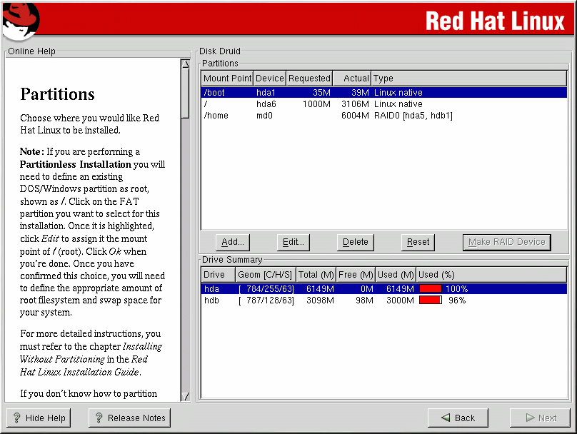 Il RAID software può essere configurato durante l'installazione di Red Hat Linux oppure durante un'installazione kickstart. Potete utilizzare sia fdisk che Disk Druid per creare la configurazione del RAID, ma in questa sezione ci concentreremo soprattutto sull'uso di Disk Druid.