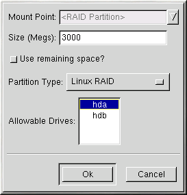 Se state creando una partizione RAID di /boot, occorre selezionare il livello 1 di RAID e utilizzare i primi due dischi (prima IDE, poi SCSI). Se non state creando una partizione RAID di /boot ma una partizione di /, occorre selezionare il livello 1 di RAID e utilizzare uno dei primi due dischi (prima IDE e poi SCSI). |