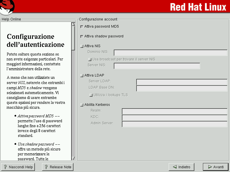 A meno che non stiate configurando il vostro sistema per accedere a una rete NIS, noterete che sono selezionate solo le password MD5 e la password shadow (vedere la Figura 4-14). Si consiglia l'uso di queste opzioni per migliorare la sicurezza della macchina.